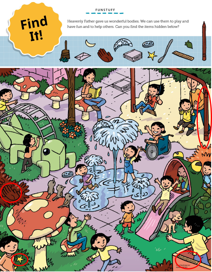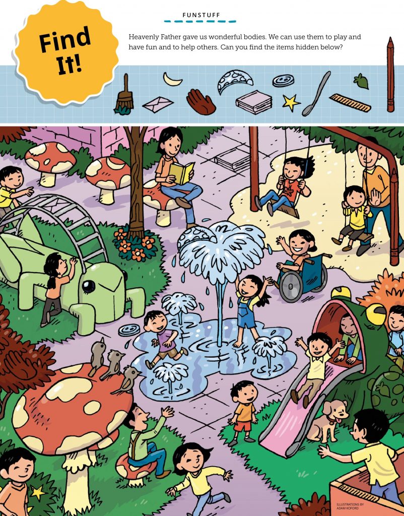 This “Find It!” playground illustration proves that a single image can do many things at once. It entertains. It challenges. It calms. It teaches.