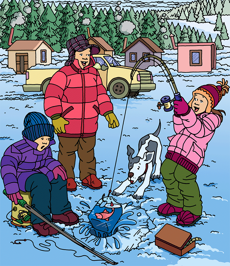 Hidden object art turns ordinary scenes into extraordinary adventures. This ice fishing illustration is filled with cleverly concealed details — items and shapes that blend into the environment so seamlessly, you might miss them at first glance.
