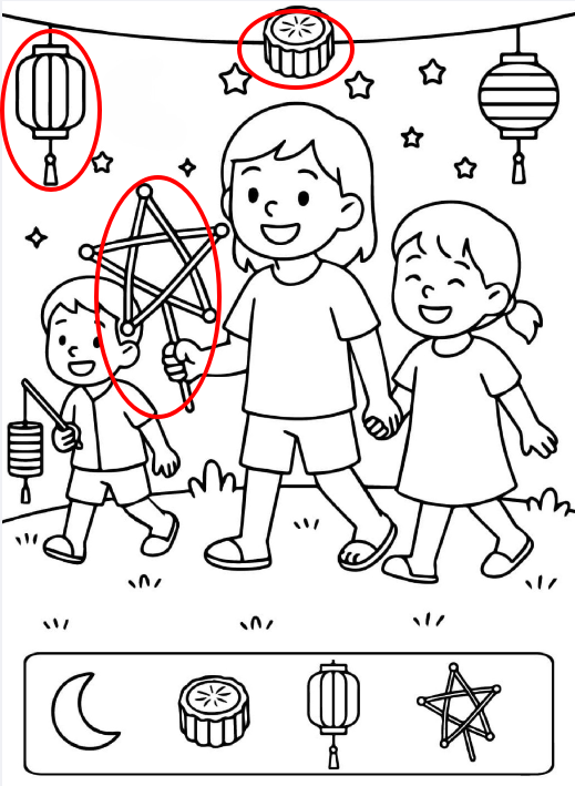 The star might echo the shape of the lantern the child holds. The lantern may hide among hanging decorations. The mooncake could blend into a pattern or circular shape you barely notice at first. The crescent moon might sit quietly in the background, easy to miss if your eyes move too fast.