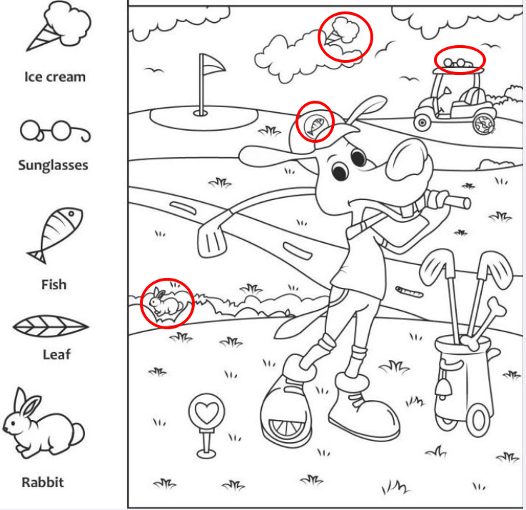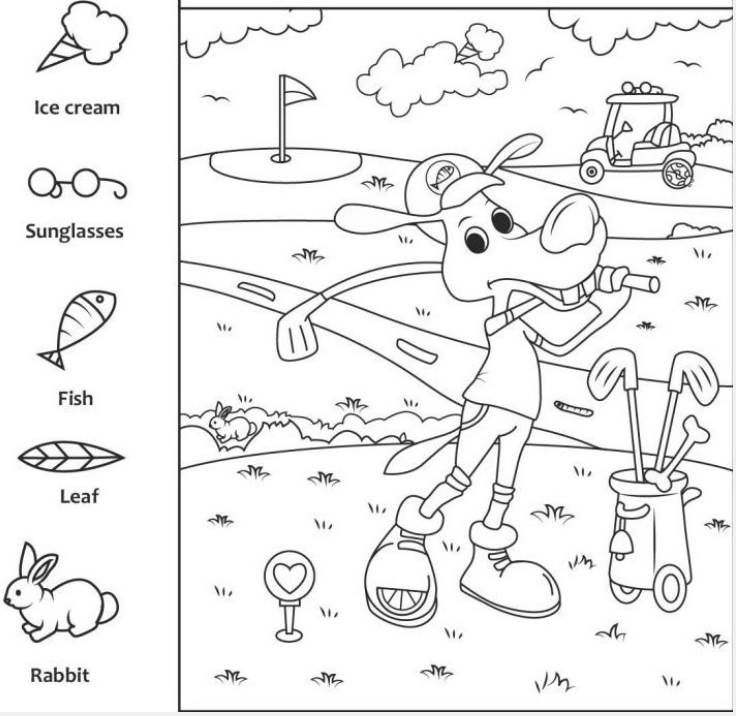 This golf-themed hidden object illustration proves that learning doesn’t have to be loud or complicated. With a calm setting, a charming character, and cleverly hidden items, it turns a simple picture into an engaging experience.