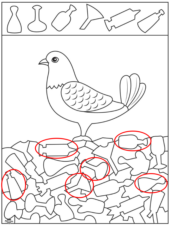 The pile beneath the bird is where the real challenge lies. Dozens of shapes overlap, stack, and tangle together. Each one is drawn in thick, clean lines, making them easy to spot but not necessarily easy to identify. Here’s what makes this section so fun to explore: