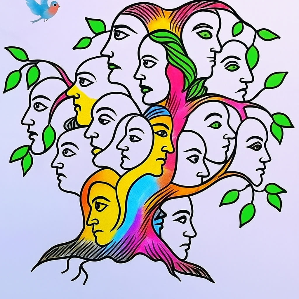 This tree of faces artwork succeeds because it mirrors the human experience with honesty beauty and depth. It uses color line and form to explore identity without explanation. Each face becomes a thought. Each branch becomes a path. Together they create a visual metaphor for growth complexity and inner harmony. In a world full of noise this image stands out by being quiet thoughtful and deeply human.