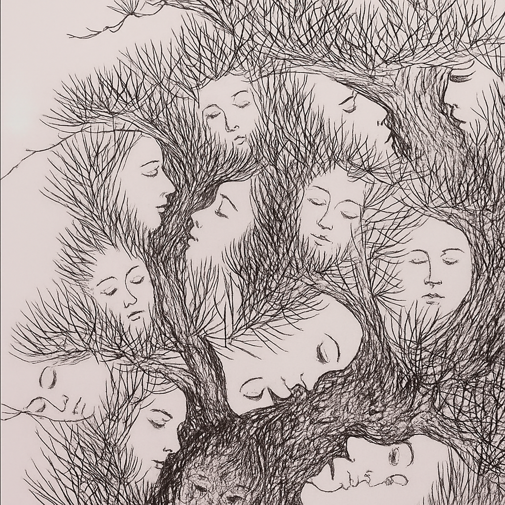 In the hauntingly beautiful image above, branches twist and weave together, their lines forming serene, sleeping faces. It’s more than a drawing — it’s a poetic vision, where nature and humanity merge into one living, breathing form. This artwork captures a timeless theme: the deep connection between life, memory, and the natural world. Like a dream suspended between waking and sleep, it invites us to reflect on growth, harmony, and the quiet strength rooted within us all.