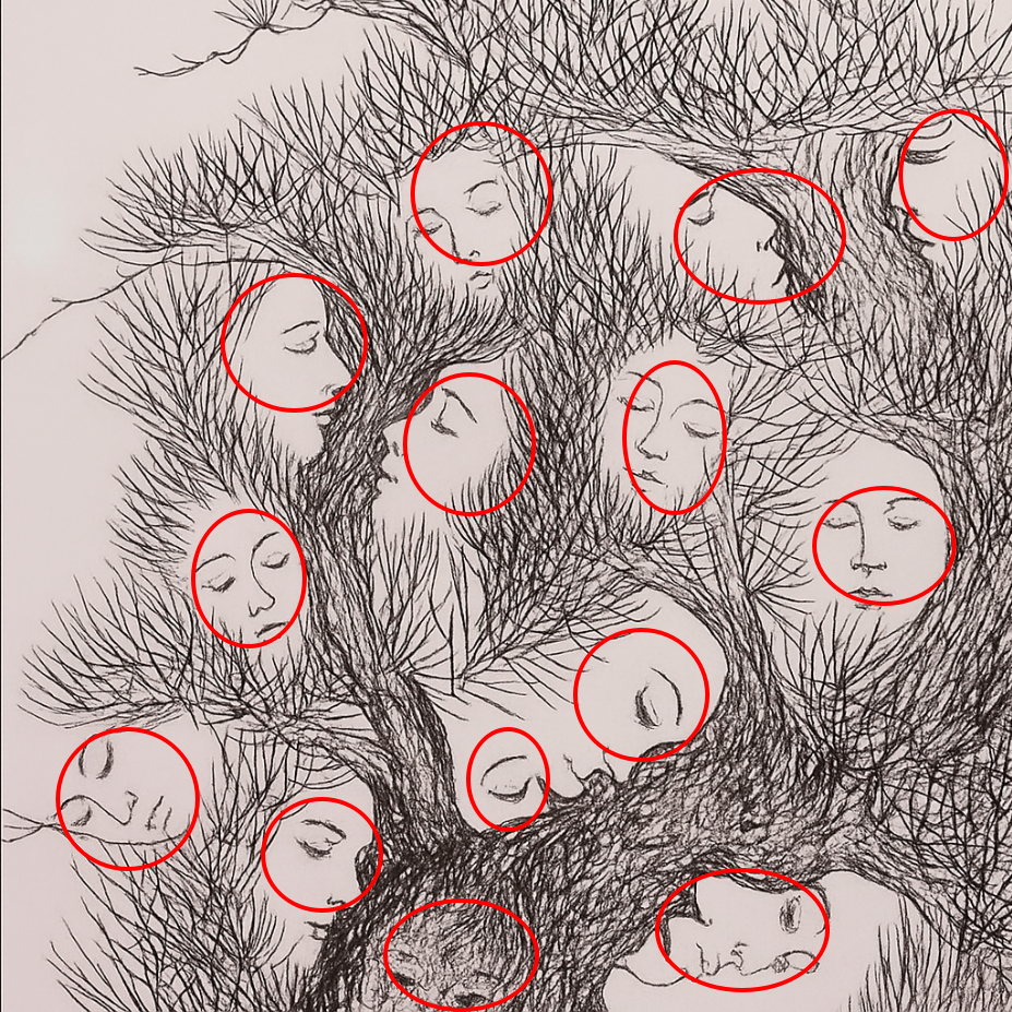 Some faces appear more distinct, others fade into the branches — just as some memories remain vivid while others blur with age. Together, they form a mosaic of existence. The message seems clear: no part of life is ever truly lost; it all becomes part of something larger.