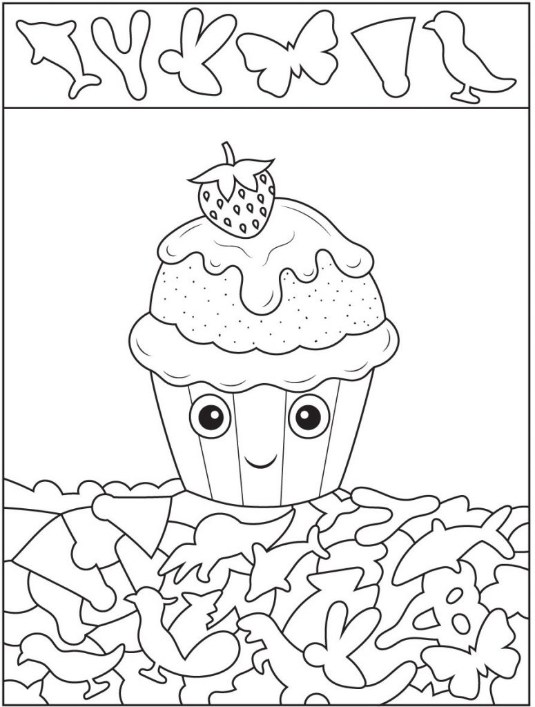 At the center of the scene sits a cheerful cupcake topped with creamy frosting and a strawberry. The cupcake even has a friendly face, turning a simple dessert into a fun cartoon character. Beneath it lies a busy pile of overlapping shapes where several hidden objects are cleverly disguised.