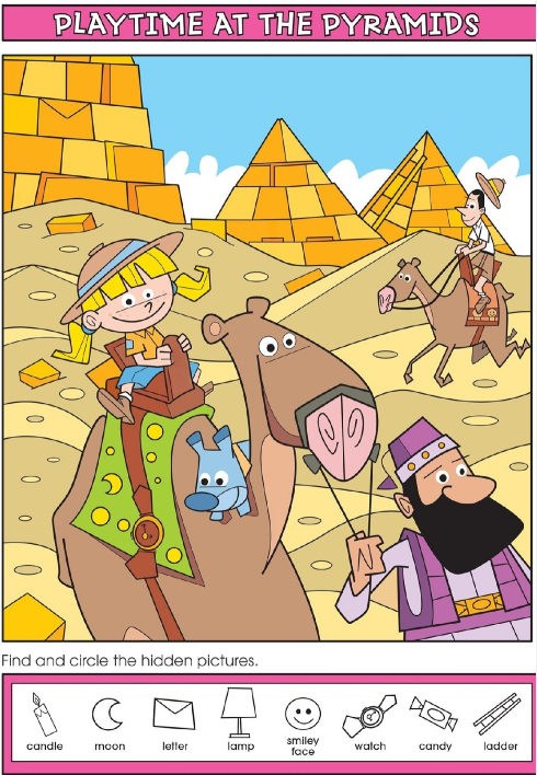 What makes this illustration so delightful is its hidden object charm. The artist has cleverly tucked small surprises into the scenery, turning a simple desert ride into a puzzle of discovery. Let’s put on our explorer hats and start searching: