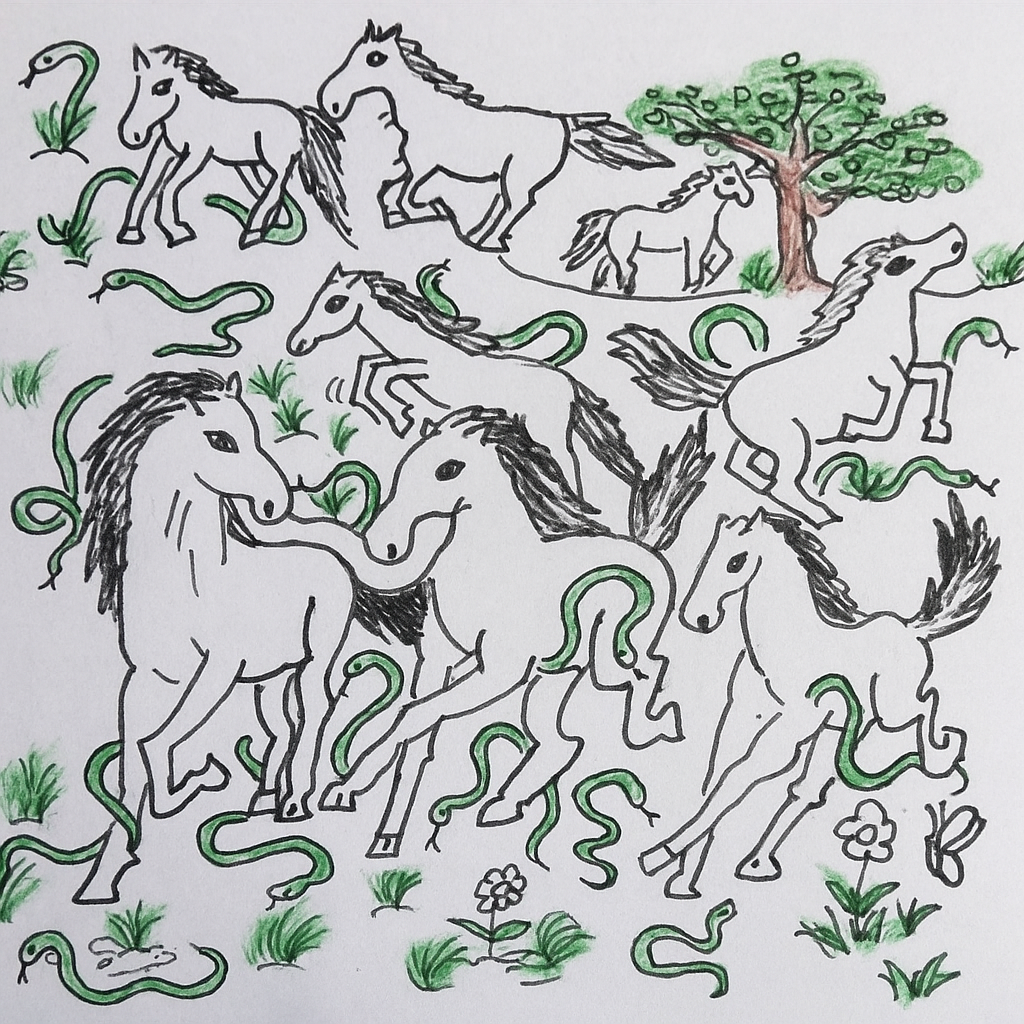 In this drawing, the artist uses the rhythm of repetition to play tricks on your mind. The horses’ legs and tails form lines similar to the snakes’ bodies, blending seamlessly into the green grass. The more you stare, the more the image shifts — horses seem to move, snakes seem to slither, and suddenly you’re unsure what’s real and what’s drawn to deceive.