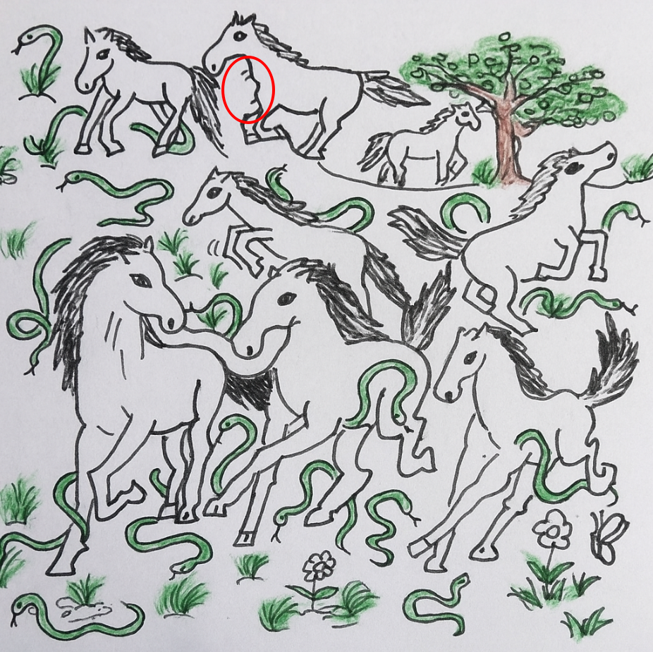 Here’s a tip: focus on the color contrast. The snakes are drawn with soft green shading, while the horses are outlined in darker tones. Once your eyes adjust, you’ll start seeing patterns emerge — maybe a coiled shape near the tree, or a snake slithering behind a horse’s tail.