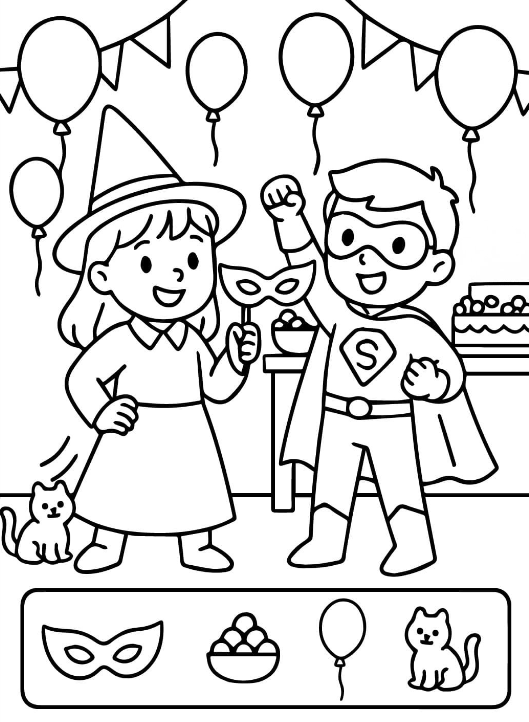 There’s something enchanting about a children’s costume party. Maybe it’s the way kids light up when they get to become their favorite characters, or how a simple mask can turn an ordinary moment into a magical one. In the illustration, we see two cheerful children—one dressed as a witch and the other as a superhero—celebrating what looks like the best party of the year. Their playful energy, surrounded by balloons, cake, and festive decorations, creates a warm scene that captures the wonder of childhood imagination.