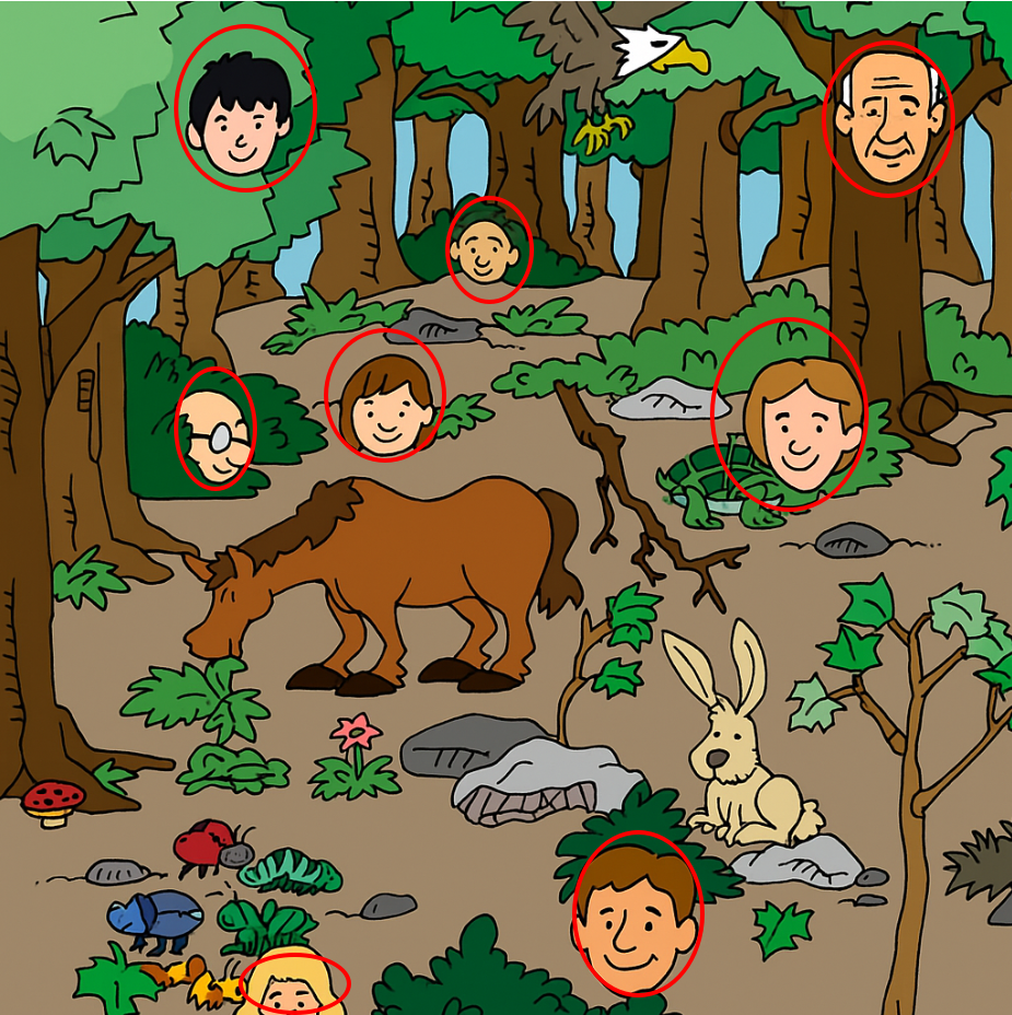 Hidden object puzzles like this one invite us to do something rare in today’s fast-paced world — slow down and truly look. At first, you might see just the animals and trees. But as your eyes adjust, you’ll begin to notice the faces cleverly woven into the landscape — a profile shaped by branches, an elderly face carved into the bark, a child’s grin peeking through the leaves.