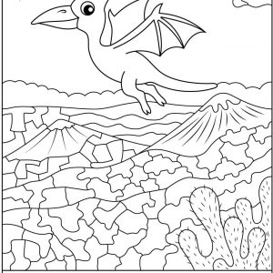 At first glance, this image feels calm and almost meditative. A flying dinosaur glides across a prehistoric sky, wings spread wide above volcanoes, clouds, and strange ancient…