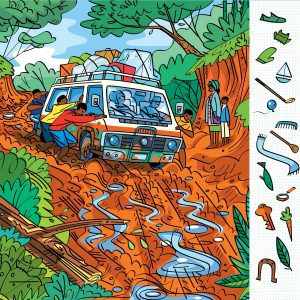 Overcoming the Muddy Road: A Hidden Adventure in Teamwork and Determination When you first look at this vibrant illustration, you can almost feel the squishy mud under…
