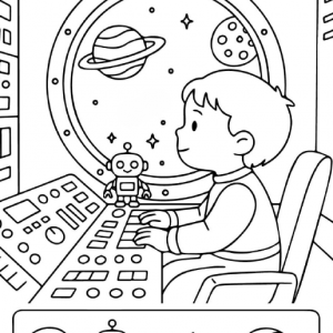 This image opens a window straight into childhood wonder. A young space explorer sits confidently at a control panel, gazing out through a round spacecraft window where…