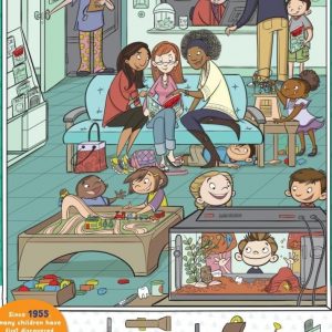At first glance, this image looks like a simple doctors or dentists waiting room. Kids sitting. Parents standing. A nurse checking a clipboard. But look a little…