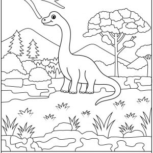 At first glance, this image feels calm, almost meditative. A friendly long neck dinosaur stands peacefully in a prehistoric landscape. Trees rise softly in the background. Hills…