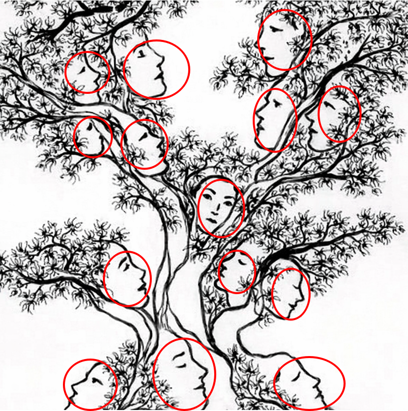 At first glance, this image appears to be a simple black and white drawing of a tree. Branches stretch outward, leaves scatter delicately, and the composition feels calm and organic. But then something unexpected happens. Faces begin to emerge. Profiles appear in the branches. Expressions form from negative space. Suddenly, the tree is no longer just a tree.
