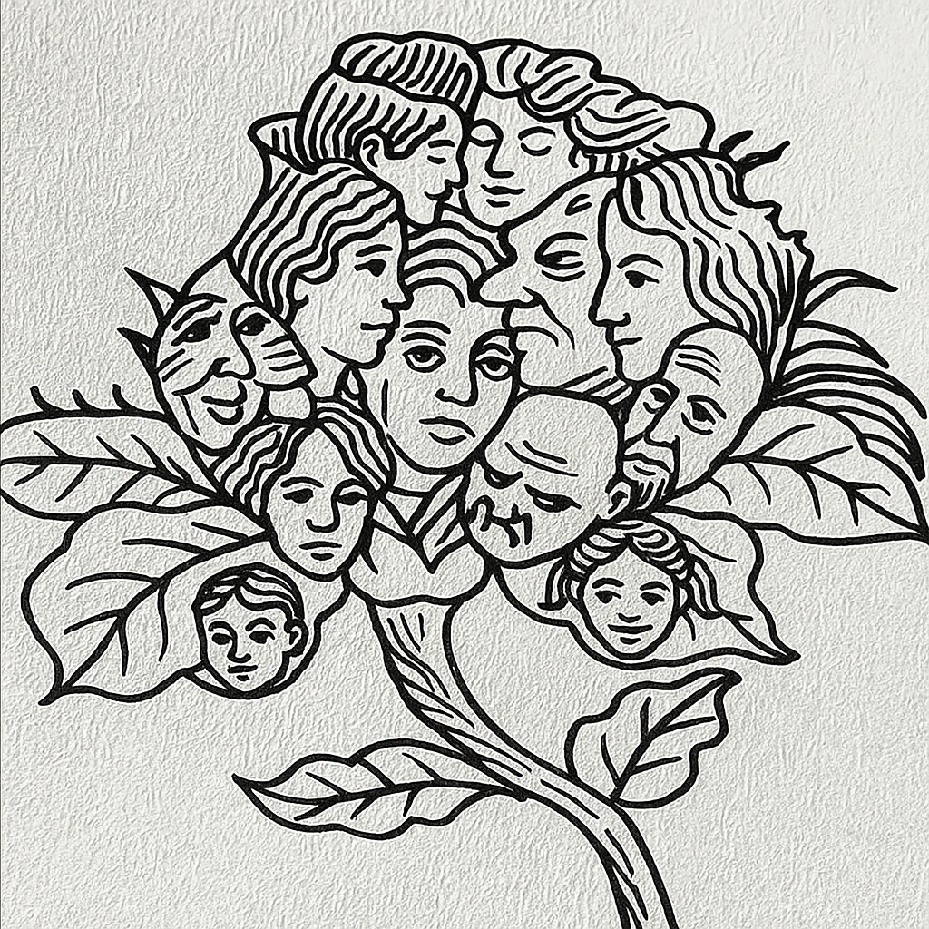 The artwork depicts a flower whose “petals” are individual faces, each with distinct features and expressions. Some appear thoughtful. Others seem joyful, weary, wise, or contemplative. Every face adds a different energy, creating a harmonious yet complex whole.