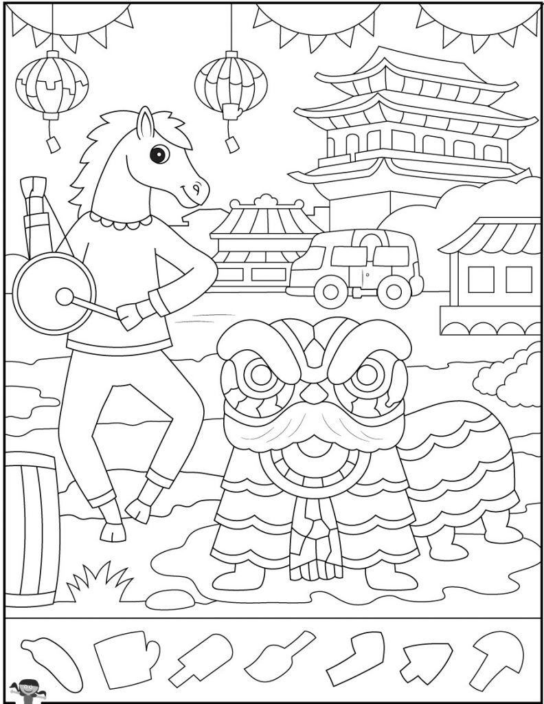 There’s something magical about cultural festivals—the colors, the rhythms, the excitement floating in the air. And the scene before us captures that magic perfectly. A lively, imaginative world comes to life with a dancing lion, lantern-filled skies, bustling buildings, and even a cheerful figure with a horse mask beating a traditional drum. It’s the kind of illustration that immediately pulls you in, inviting you to experience the joy and rhythm of a classic celebration.