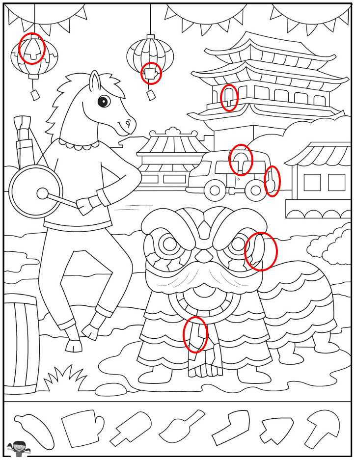 This delightful festival scene paints a vivid picture of joy, tradition, and imagination. From the animated lion dance to the playful horse-masked drummer, every element bursts with life and charm. The lanterns, pagodas, and festive setting enrich the atmosphere even more, creating a celebration that feels both timeless and full of energy.