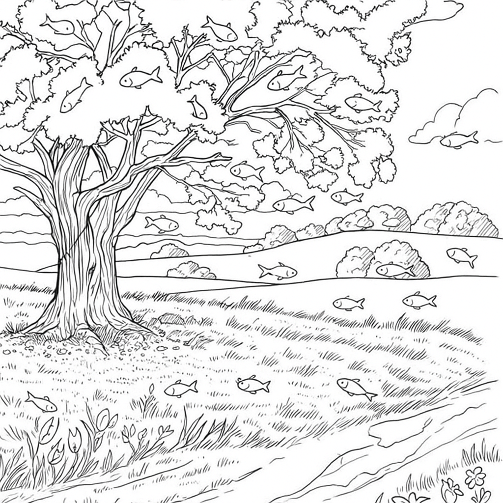 At first glance, the image seems familiar—a peaceful meadow, a sturdy old tree, and rolling hills beneath a gentle sky. But then, something extraordinary emerges. Fish swim freely through the air as if the boundaries between sky and sea have dissolved.