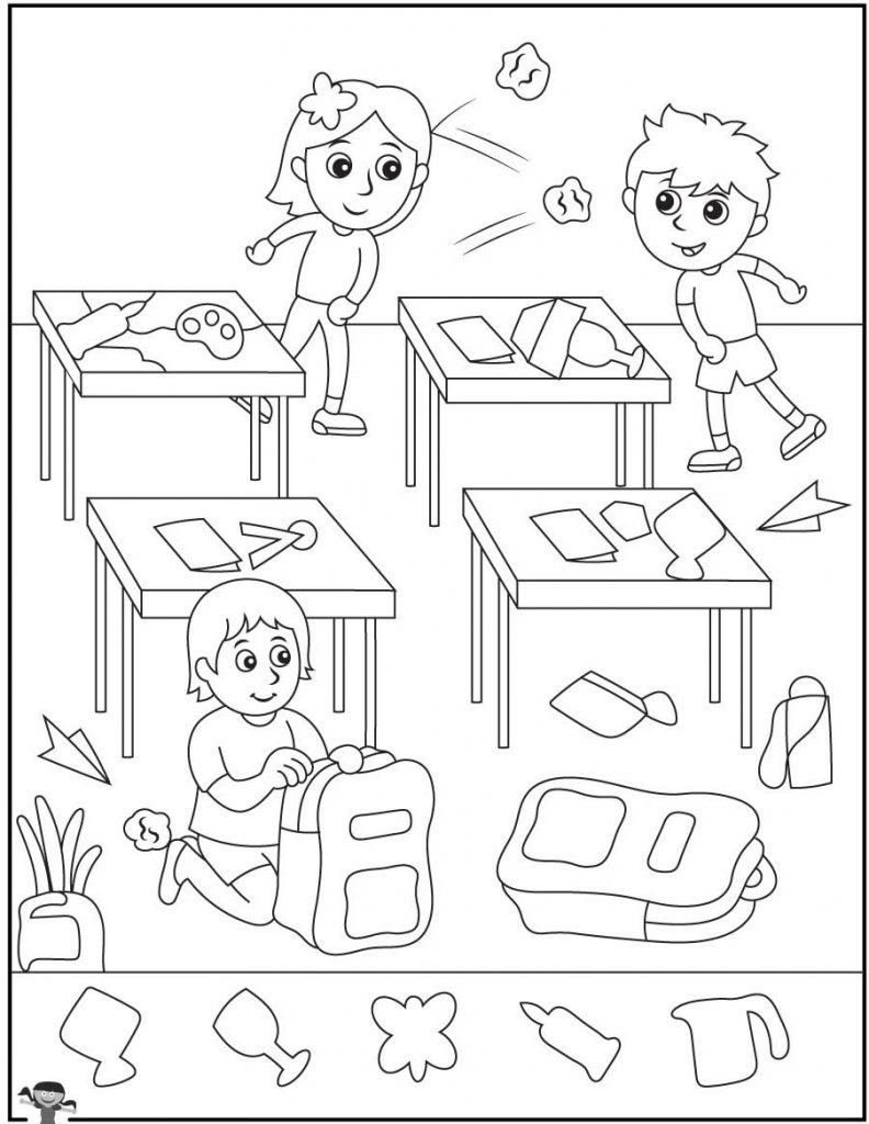 At first glance, this illustration shows a typical school day. Children stand beside their desks. Papers, art supplies, and backpacks are scattered around. One child kneels on the floor organizing a school bag. Another appears to toss a crumpled paper across the room. Desks hold notebooks, paint palettes, and classroom materials.