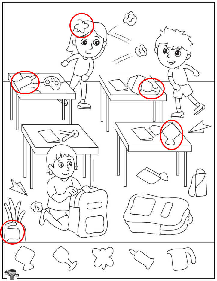 This classroom hidden object puzzle transforms an ordinary school scene into a powerful learning experience. By inviting children to search carefully among desks, papers, backpacks, and art supplies, it strengthens focus, patience, and visual discrimination skills.