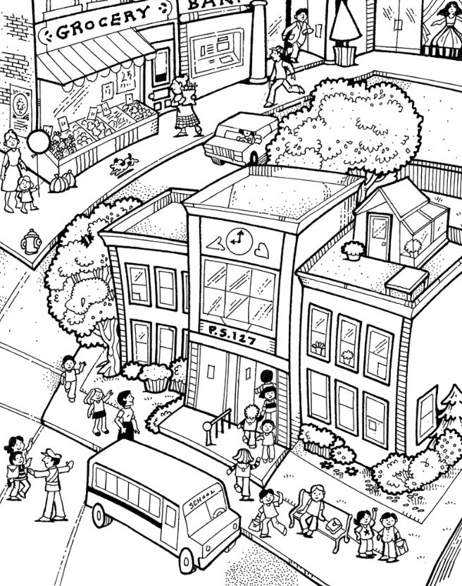The start of a new school day always carries a special kind of magic — the buzz of conversations, the rush of buses, and the comforting rhythm of routines that shape childhood memories. This lively illustration captures that energy perfectly. It’s a bustling scene set around P.S. 127, where students, teachers, and parents fill the street with motion and excitement.