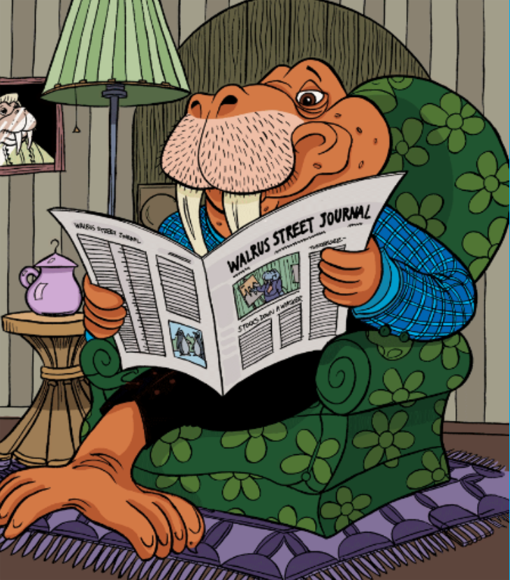 Right at the heart of the picture is a well-dressed walrus comfortably nestled into a green, patterned armchair. With a plaid shirt, content expression, and a massive newspaper in hand, he looks like he’s settling in for the coziest afternoon imaginable. His tusks peek out beneath the paper as he reads about “Stocks Down 4 Walrus,” adding the perfect touch of humor.