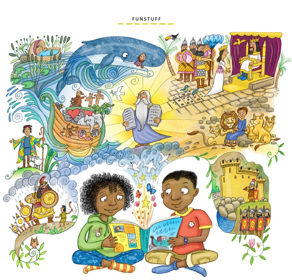 At first glance, you see two children sitting comfortably, reading together. Their faces are bright with excitement as the book in their hands releases a swirl of imagination—stars, butterflies, doves, and light flow from the pages like a magical breeze. But that’s just the beginning. Floating above them is a vivid tapestry of stories: a whale with a man inside, an ark filled with animals, tablets glowing with divine light, a powerful king on his throne, and lions sitting peacefully beside a man. Each image represents a moment of faith, courage, or wisdom brought to life through storytelling.