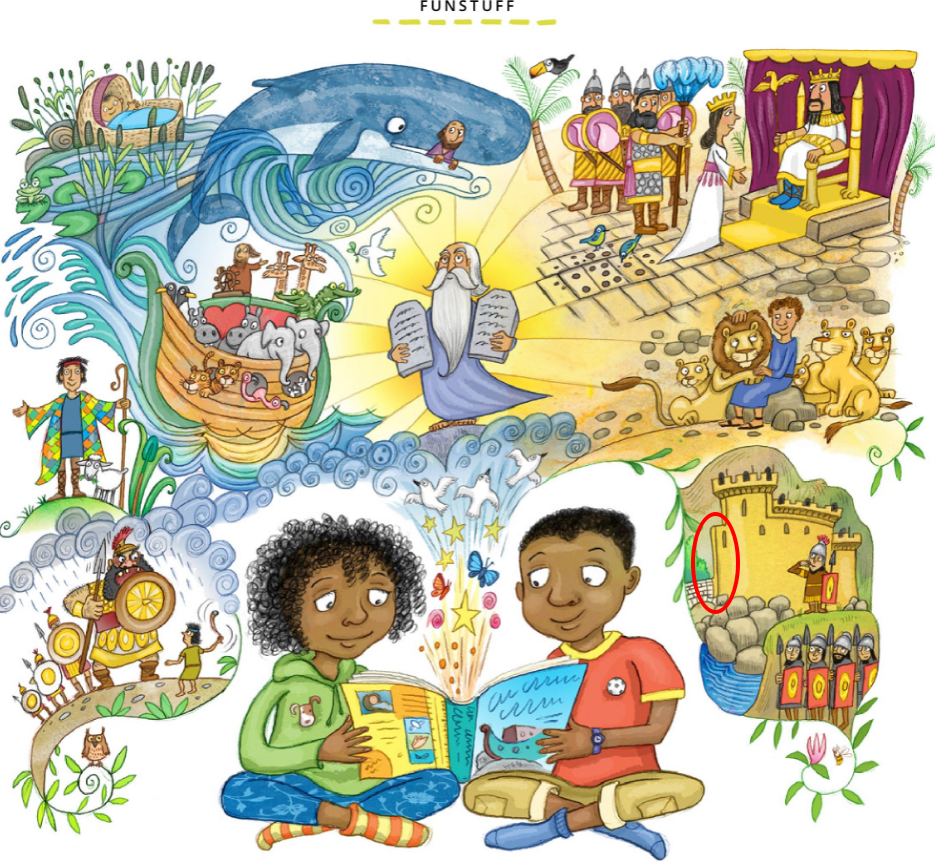 Begin at the main focal point—the glowing figure of Moses—and move outward. This helps you understand the flow of the illustration and makes it easier to connect each story.
