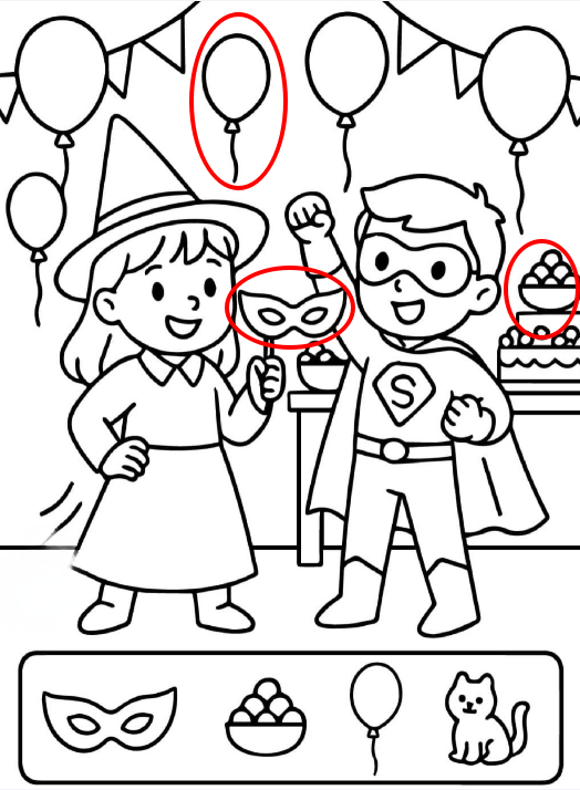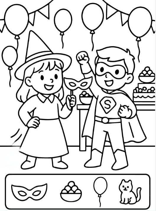 This superhero costume party hidden object puzzle combines imagination, celebration, and cognitive development into one engaging activity. Through festive decorations and playful characters, it invites children to slow down, observe carefully, and strengthen essential visual and problem-solving skills.