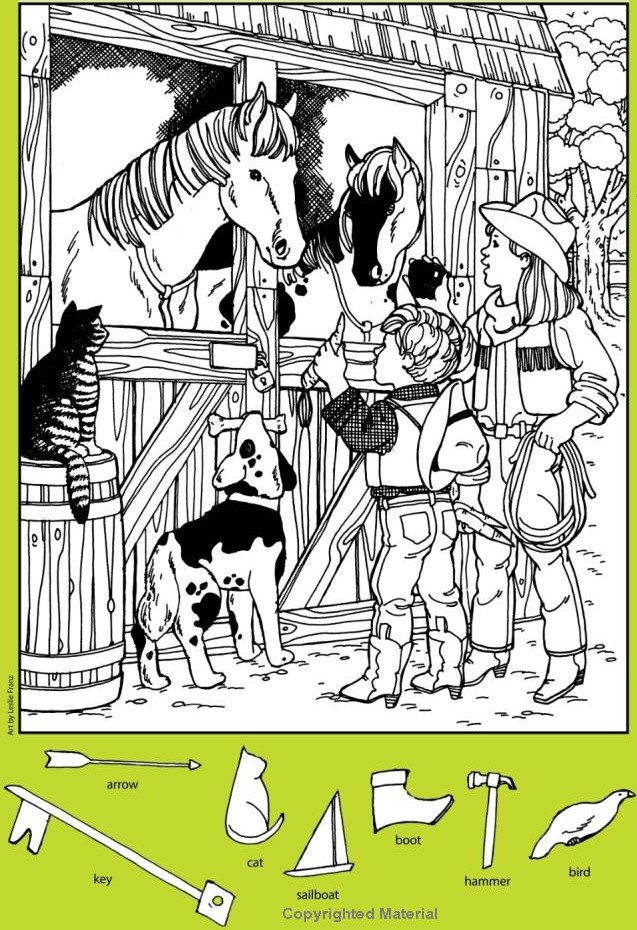 Hidden objects wait quietly within the illustration. An arrow. A key. A cat. A sailboat. A boot. A hammer. A bird. What once felt like a simple farm moment now becomes a thoughtful visual puzzle that invites you to slow down and look closer.