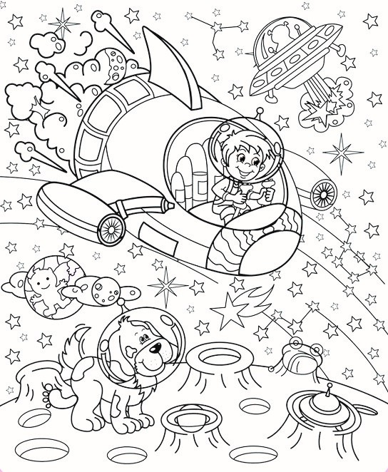 Floating all around the scene are planets and flying saucers, each with its own unique patterns. Look carefully—do the rings around a planet form a secret design? Is a UFO’s light beam concealing a hidden star or object? These playful details reward patient observation.