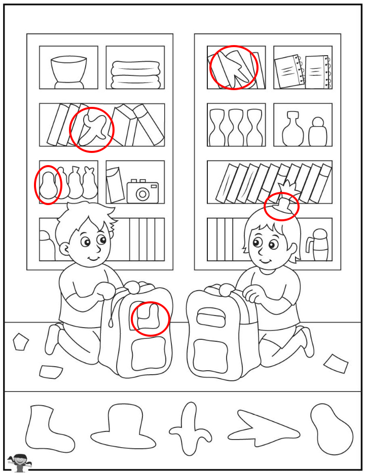 At first, you see two kids packing backpacks in a library. But once you know hidden shapes are waiting, your eyes start scanning differently. Suddenly, every book spine, every decorative vase, and every shelf corner becomes a possible hiding spot.