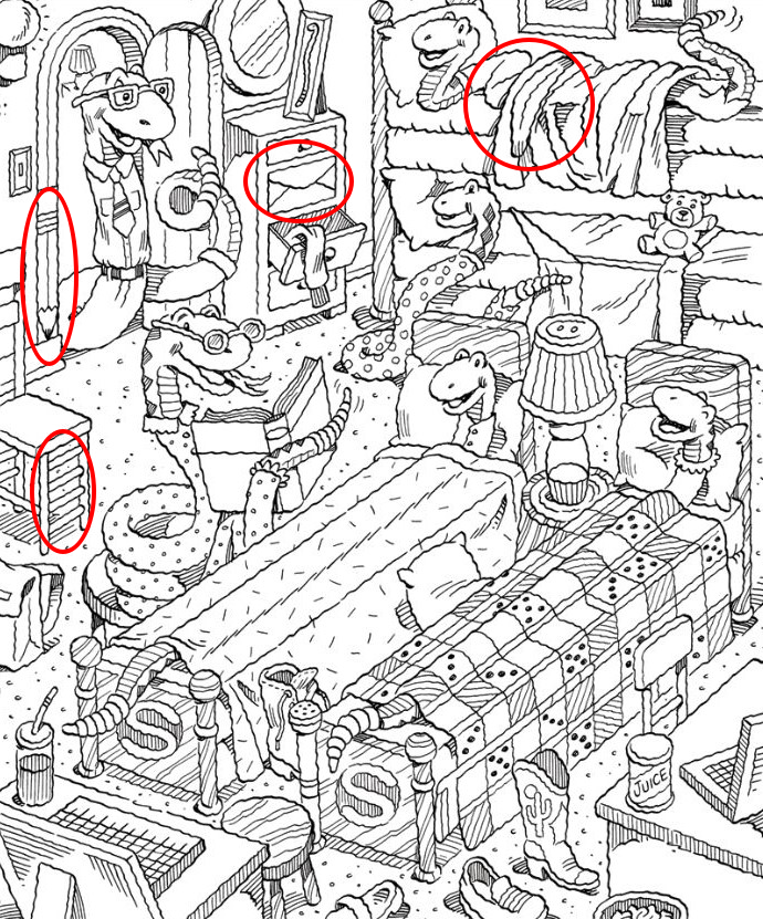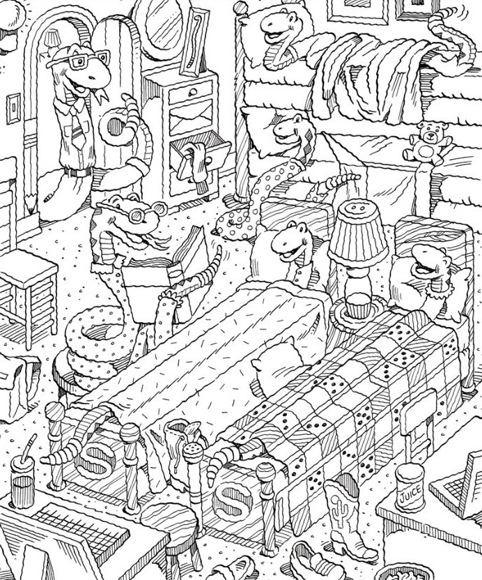 If you’ve ever wondered what a sleepover might look like in a world where cheerful reptiles run the show, this delightful illustration gives you the perfect peek. The room bursts with personality—smiling creatures curled up in beds, one reading a book, another sipping a drink, and yet another peeking from the top bunk with a grin that stretches ear to ear. Everywhere you look, something fun is happening, making this scene a treasure trove for anyone who loves imaginative artwork and hidden-object adventures.