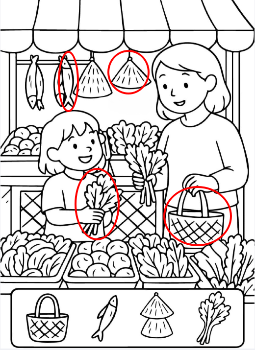 Market scenes reflect real life. Children see baskets, food, and people doing everyday activities. That realism strengthens observation skills because kids must look closely at familiar objects in unfamiliar ways.