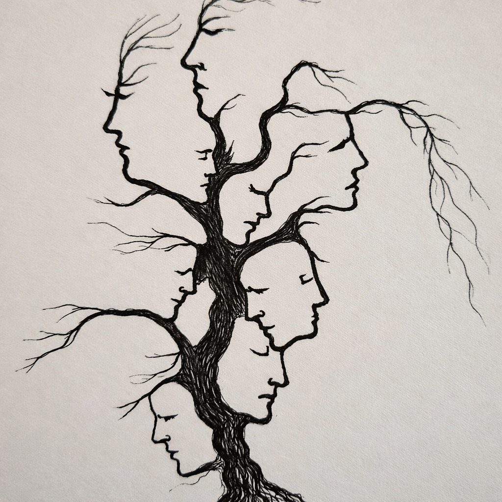 This image suggests ancestry, family, and shared history. The faces appear connected, not separate. They grow from the same trunk, branch from the same core, and exist together even when facing different directions.