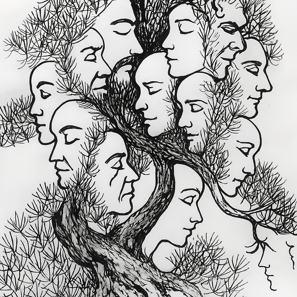Even without color, this artwork speaks loudly. The strong contrasts between the dark branches and the white spaces intensify each facial feature. The delicate strokes that form the pine needles add softness, balancing the bolder lines of the faces.