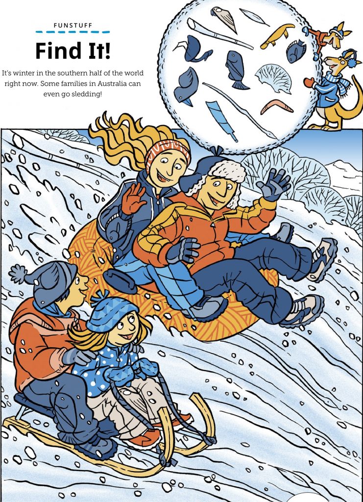 When most people imagine winter fun, they picture snowy mountains in North America or Europe—but this lively scene flips that idea upside down. Set in the southern half of the world, this cheerful illustration captures a family enjoying a snowy Australian winter. With kids and parents racing downhill on sleds and a kangaroo bundled up in a scarf and coat, the image celebrates joy, movement, and the unexpected magic of winter “Down Under.”