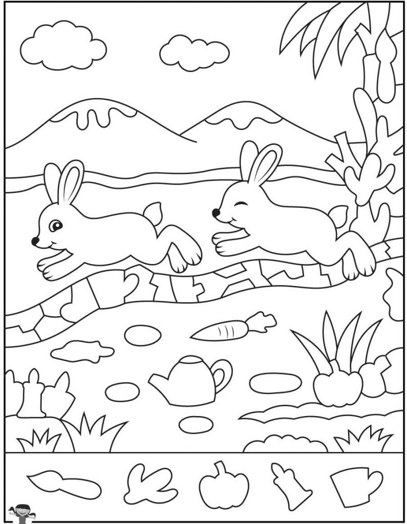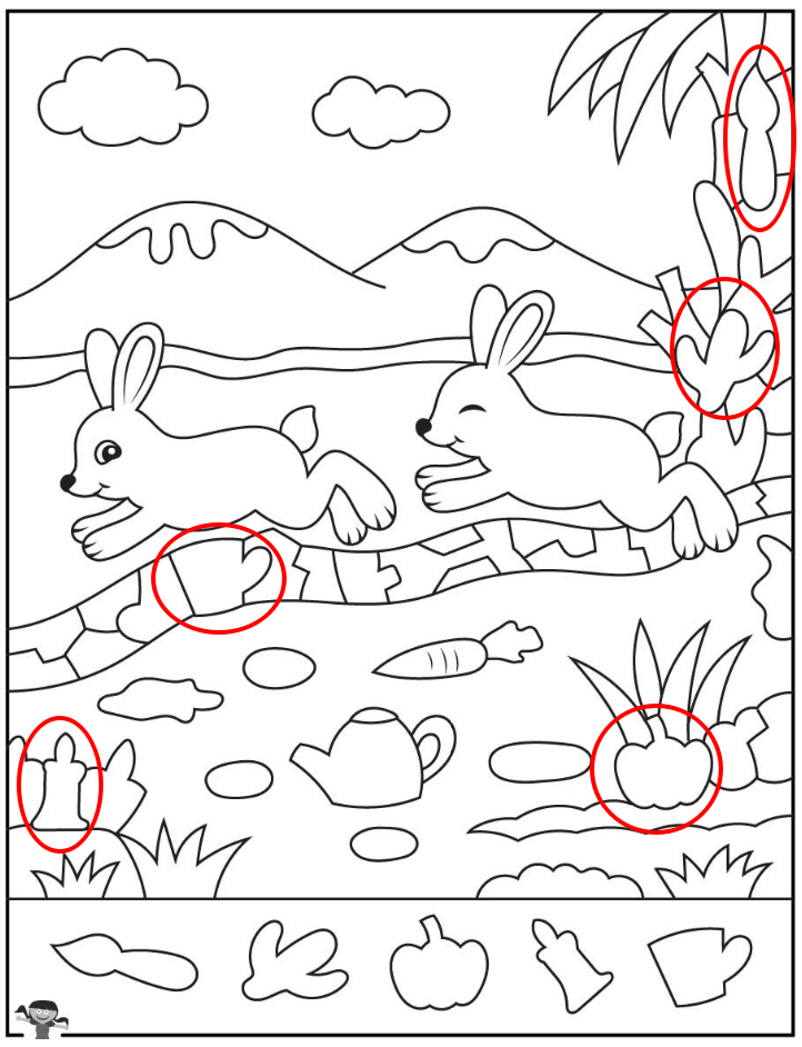At first look, this peaceful black and white illustration feels simple and sweet. Two rabbits leap happily across a winding path, surrounded by hills, clouds, plants, and gentle scenery. But this calm surface hides a clever challenge. Tucked into the landscape are everyday objects disguised as natural shapes, waiting for sharp eyes to uncover them. This is not just a drawing. It is a hidden picture puzzle designed to stretch attention, spark curiosity, and turn quiet moments into meaningful play.