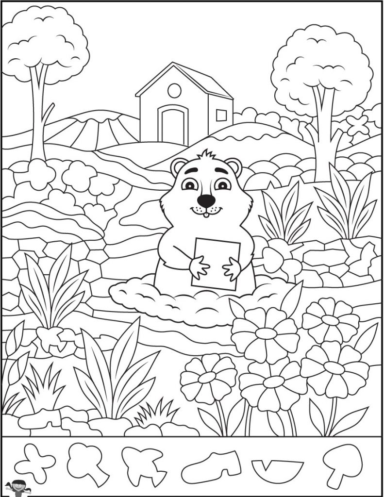 This charming illustration of a groundhog popping out of its burrow captures everything we love about nature-based artworks—warmth, detail, simplicity, and a hint of storytelling magic. With its flowers, hills, trees, and cozy little house, the scene offers endless opportunities for creativity, observation, and imagination. Whether you explore it as a hidden-object puzzle, a coloring page, or simply a peaceful piece of art, it invites you to slow down, look closer, and enjoy the gentle beauty of nature.