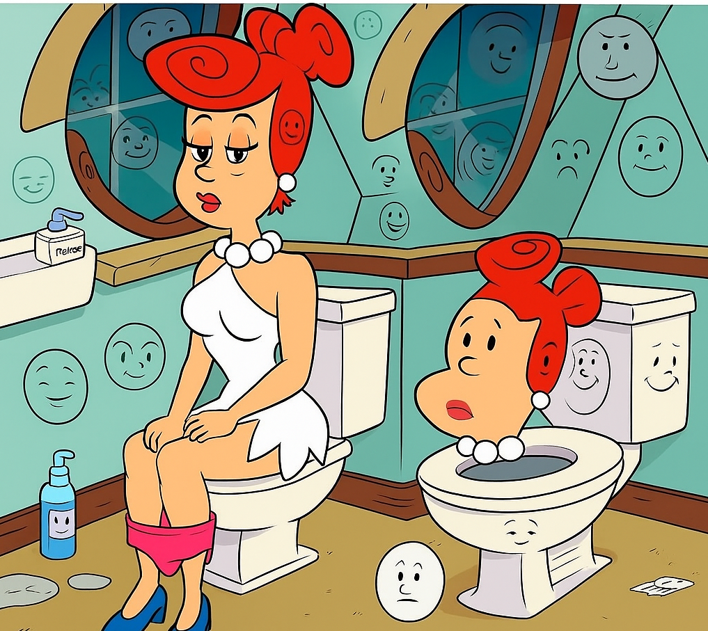 At first sight, the cartoon seems humorous—a playful bathroom illustration featuring a woman who looks oddly familiar in style, reminiscent of vintage animated characters. She sits with a composed expression, her red hair perfectly styled, wearing a classic white dress and blue heels.