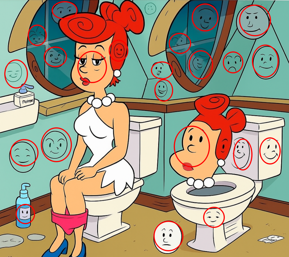 A Surreal Bathroom Illusion: Discovering Hidden Faces in a Mind-Bending Cartoon Scene