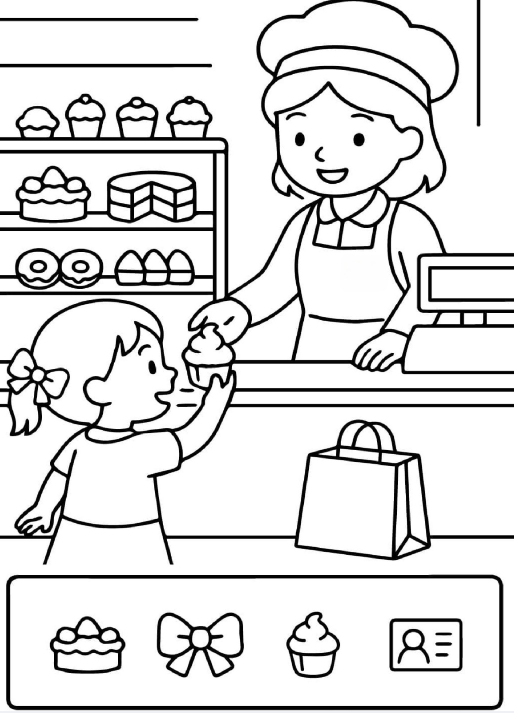 The absence of color is not a limitation here. It is an invitation. Black and white line art encourages the viewer to slow down and notice details. The shelves of baked goods, the shopping bag on the floor, and the simple expressions all stand out clearly.