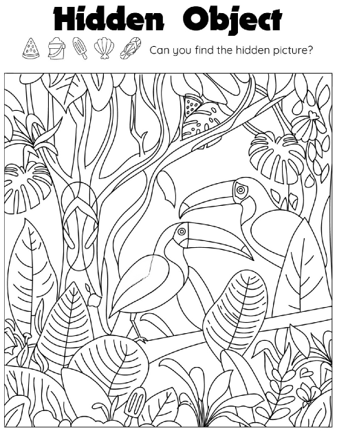 Start with the toucans, the stars of the scene. Their long, curved beaks might be concealing subtle shapes or outlines that blend into the background. The branch they’re perched on could also hold a surprise — maybe a hidden animal or object carved into its texture.