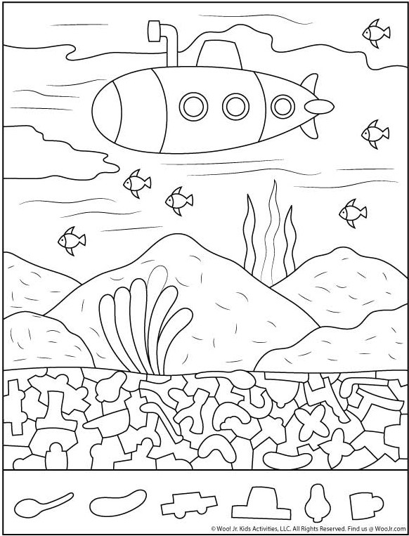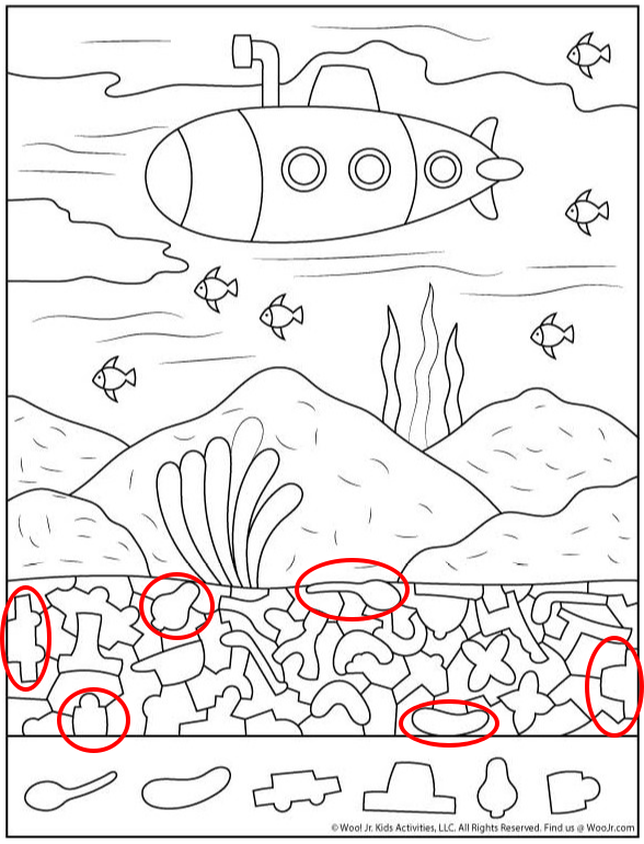 This underwater hidden object illustration proves that simple art can deliver deep engagement. With a calm ocean scene, a playful submarine, and cleverly hidden shapes beneath the surface, it transforms a peaceful picture into an engaging mental challenge.