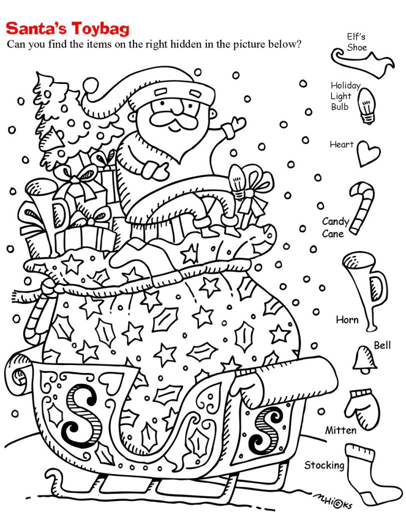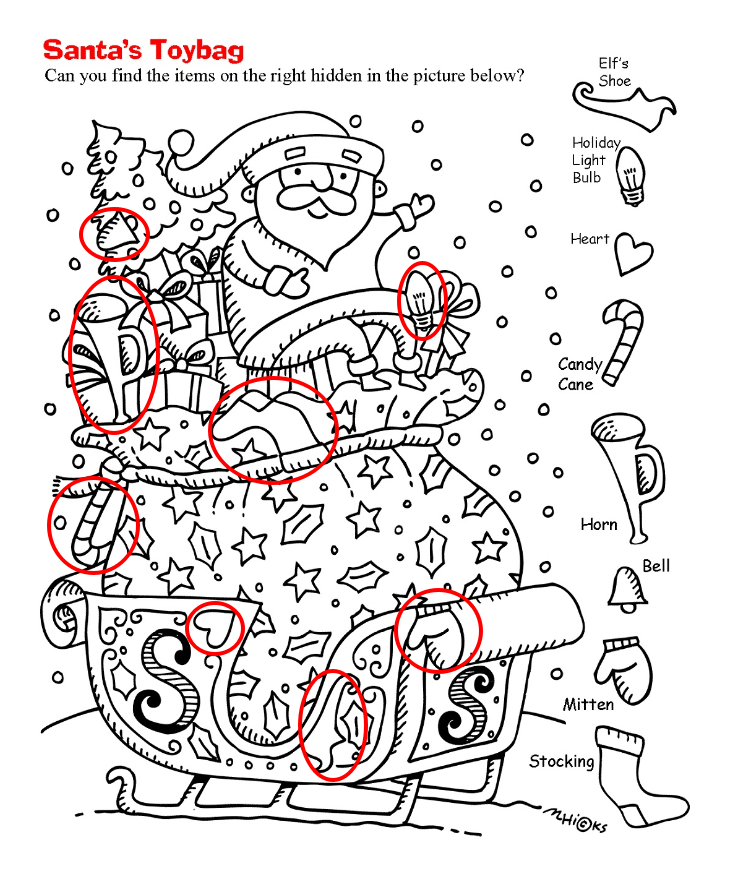 - Pay attention to lines. Many hidden shapes follow natural outlines, such as the folds of Santa’s bag or the sleigh’s curves.
